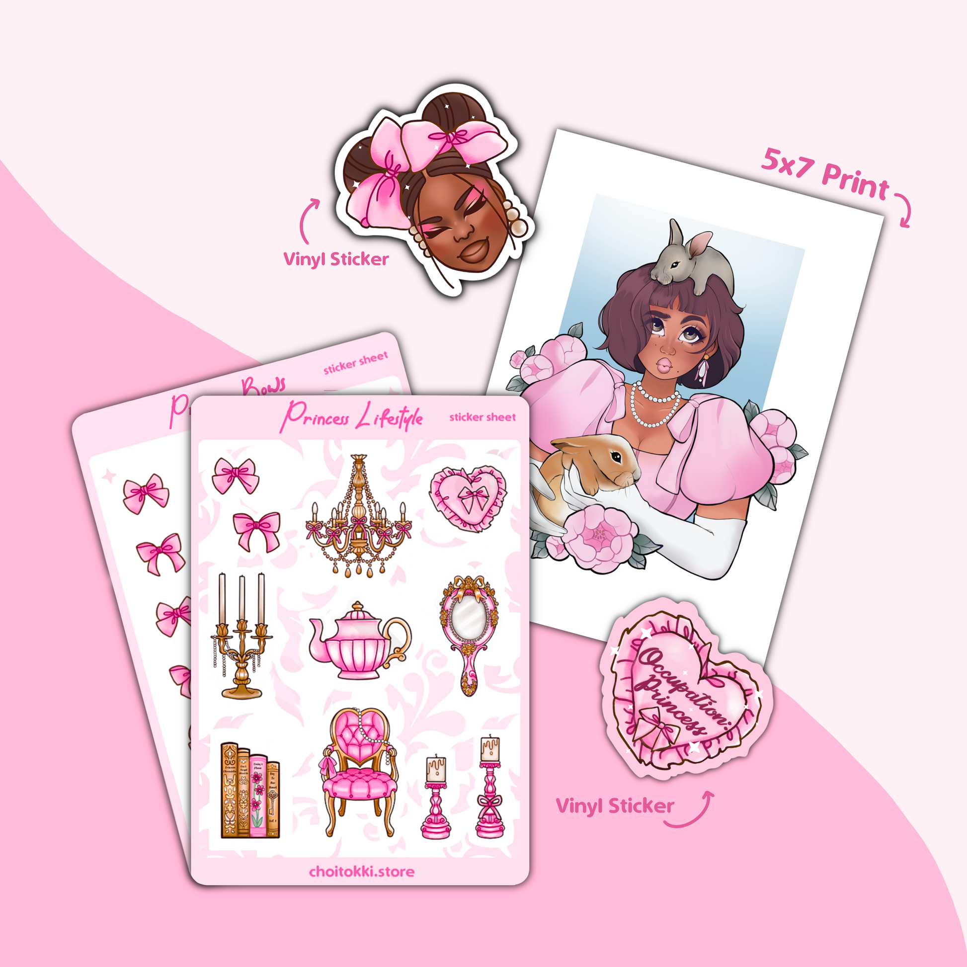 Add a touch of glam and sparkle to your life with the Princess & Bows Collection. This set includes 5x7 prints, two vinyl stickers with shimmering iridescent accents, and two sticker sheets for endless fun. Perfect for those who love all things princess and cute bows.🎀