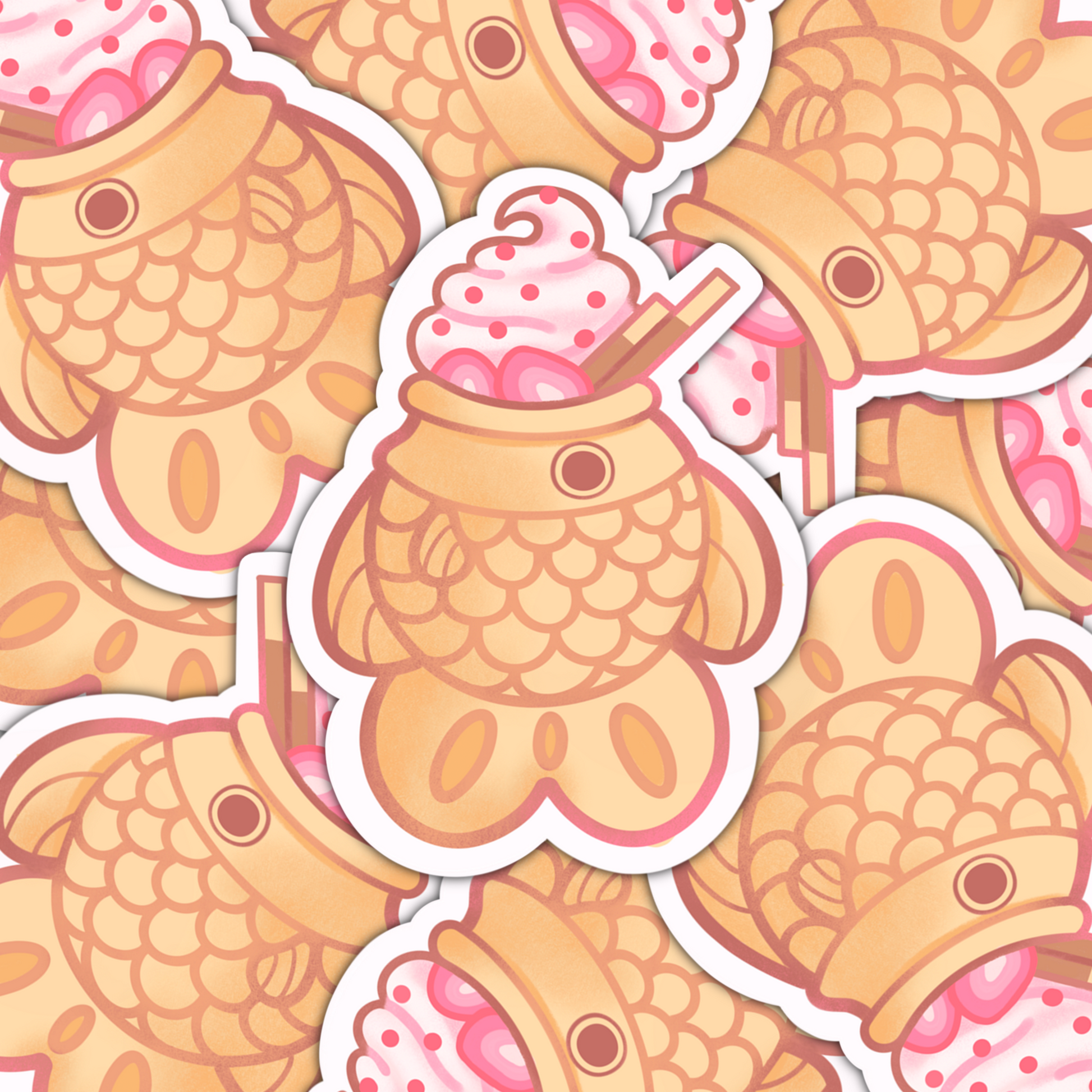 "Get hooked on cuteness with our Taiyaki Strawberry Fish Sticker. This playful sticker features a fish-shaped ice cream treat with a sweet strawberry twist. Perfect for adding a fun touch to your notebooks, laptops, and more!"🍓